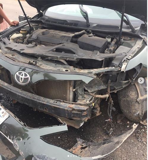 The actress who was travelling in her Toyota Camry popularly known as 'muscle' came out of the car wreck unscathed while the car was badly damaged.