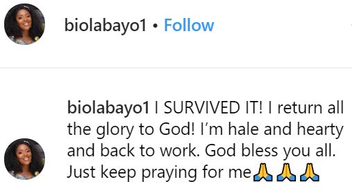 She wrote: "I SURVIVED IT! I return all the glory to God! I’m hale and hearty and back to work. God bless you all.