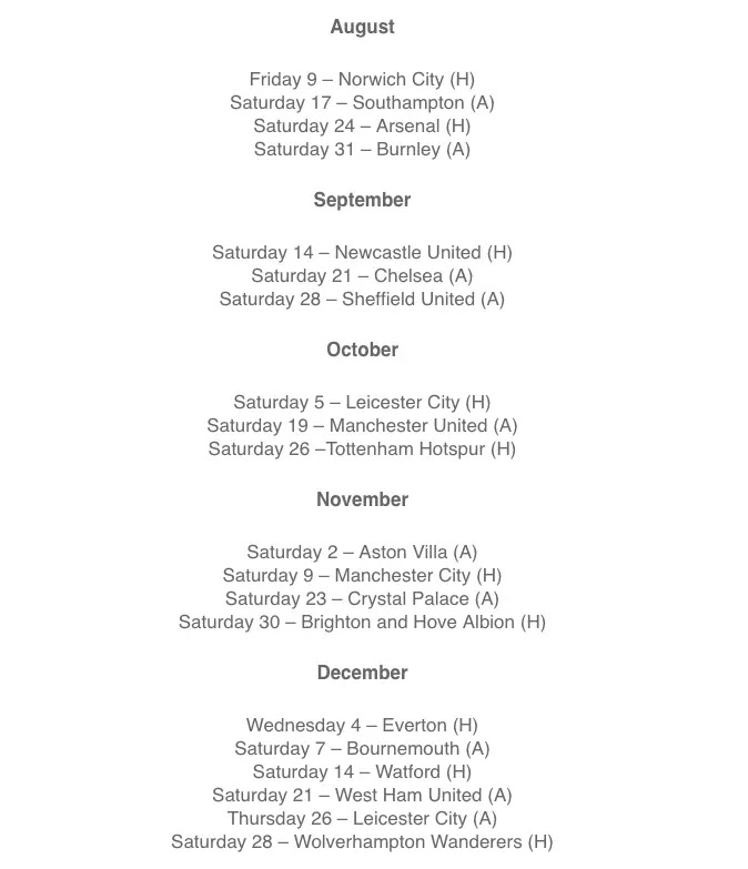 City are set to take on Manchester United at home on December 7 before heading to Old Trafford for the return fixture in March. They go to Anfield on November 9 and welcome Liverpool to the Etihad Stadium on April 4.